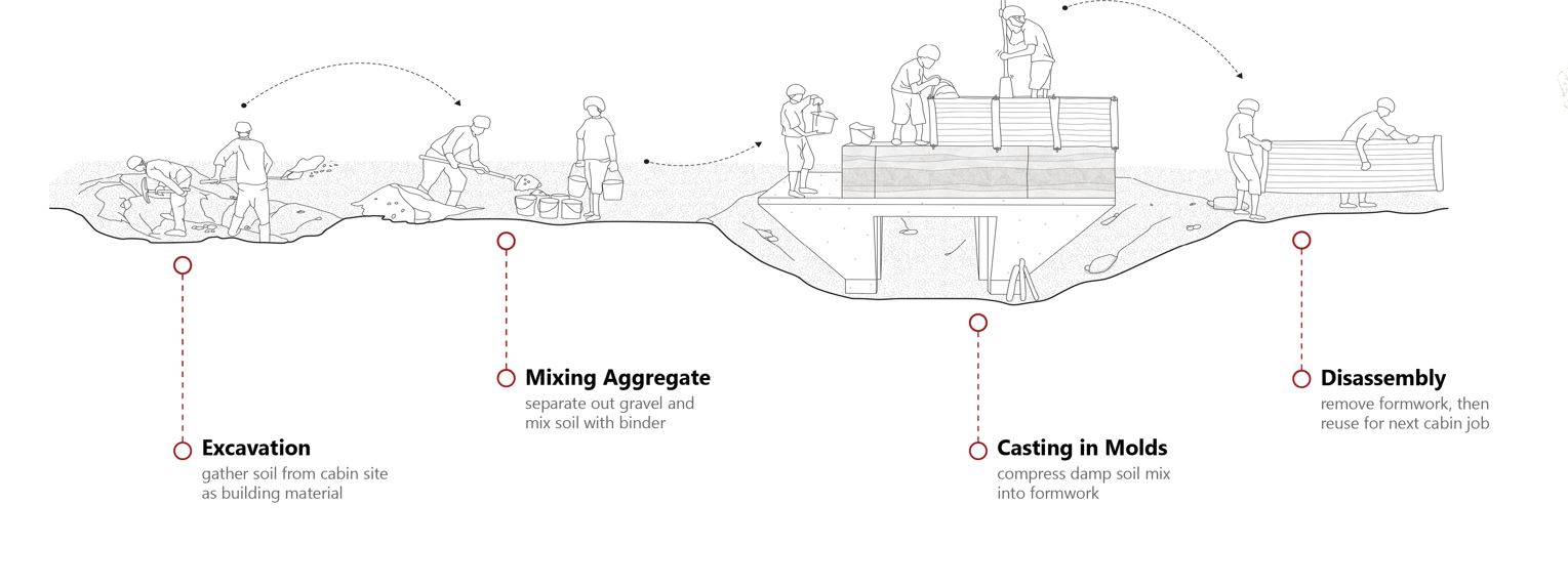 Our aesthetic became enamored with rammed earth as the primary mode for achieving conservation ecology, in which our residences are erected using predominantly earth removed by on-site excavation. The residences bridge Nivola’s artistic legacy given the conspicuous assembly and aesthetic similarities of rammed earth to sand-casting; furthermore, the sculpted towering profiles of the residences aptly rise above the surrounding tree canopy formalizing an iconic vista for native Oranians living across the valley, all the while nimbly weaving between the tight arboreal constraints of the grove. The idiosyncratic arrangement and craft of the residences lends individual character to form, fostering opportunities for guests to experience many welcome surprises in their stay at the Nivola Museum.